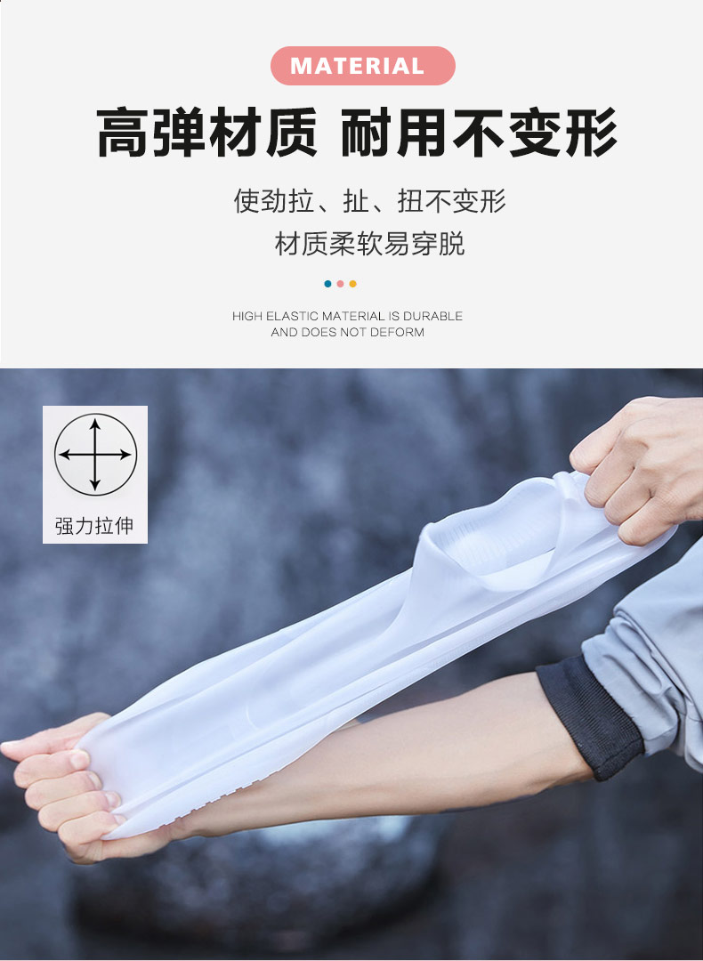 這款硅膠防水鞋套使用的時(shí)候就比較方便了,在需要使用的的時(shí)候把鞋套進(jìn)去就可以了,小巧方便,不占地方又不影響美觀,方便省時(shí),重要的是,即使是大雨磅礴的天氣,你的鞋子依舊可以完好無(wú)損。它使用的是食品級(jí)硅膠原材料制作的,環(huán)保安全,無(wú)異味,不會(huì)讓你聞到任何廉價(jià)塑料的味道。